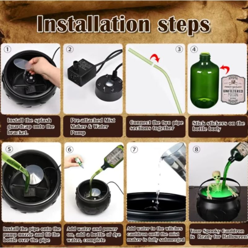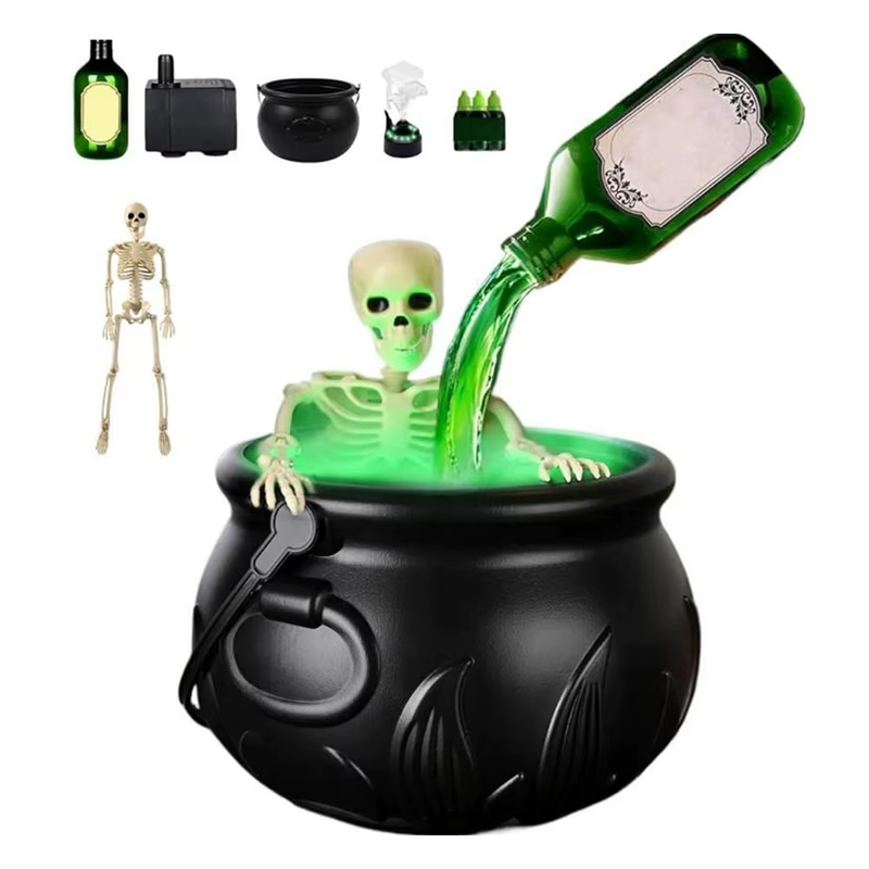 Um grande pote com uma garrafa flutuante e um esqueleto.